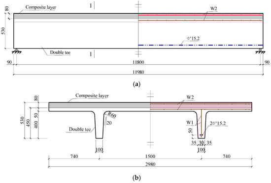 Geometry and reinforcement layout of the double-tee specimen. (a) Side elevation view of the double-tee specimen; (b) Reinforcement details of Section 1–1.
