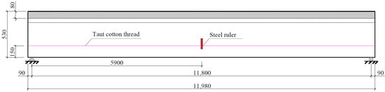 The mid-span vertical deflection of the double tees under stacked loading was measured using a taut string method. After the specimens were placed on their supports, a steel ruler was affixed to the side face of the rib at mid-span. Steel bars were embedded 150 mm above the base of the supports at both ends, across which a string was tensioned by using weights at both ends to maintain straight alignment. The vertical deformation was determined by reading the scale on the steel ruler at the point where the taut string intersected it, as illustrated in Figure 4.