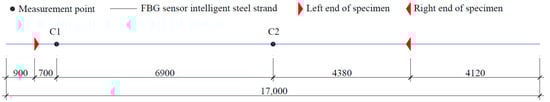 To monitor the effective prestress in the tendons, fiber Bragg grating (FBG) sensors were employed. These sensors were bonded into precision-milled grooves along the central wire of each prestressing strand. The FBG sensors were connected to an optical demodulation instrument via optical leads, allowing real-time monitoring of central wavelength shifts, which were subsequently converted to axial stress values [25]. Six prestressing strands were designated as 1# through 6#, with one installed in each specimen. Two measurement points—labeled C1 and C2—were positioned along each strand, as shown in Figure 5.