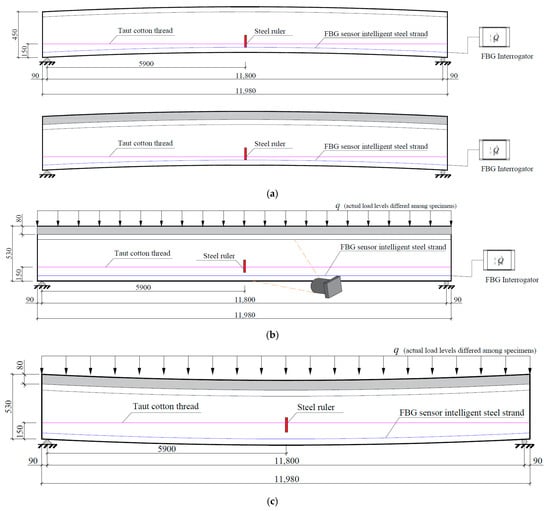 Overview of the experimental procedure and measurements conducted in each phase. (a) Phase I: Prestress Release & Storage (Day 0–320); (b) Phase II: short-term flexural test (after day 320); (c) Phase III: long-term sustained loading.