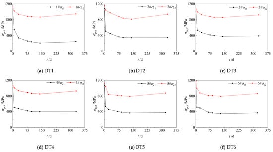 Before loading, the stresses at measurement points C1 and C2 on each of the six smart prestressing strands were recorded and denoted as σC1 and σC2, respectively. The measured effective prestress σpe,t over time is presented in Figure 7, where t = 0 represents the casting date of the specimens. At t = 0, the measured stress matched the applied jacking stress. Following prestress release, a significant drop in tendon stress was observed, with a more pronounced decrease observed at point C2. Both C1 and C2 showed an initial rapid decline in stress, followed by a gradual stabilization. By the time the topping layer was cast—around 140 days—the stress curves had nearly plateaued, indicating stabilization of the tendon stress. At this stage, the measured stress at point C2—located near mid-span—across all six smart prestressing strands remained consistent at approximately 800 MPa. In contrast, the stress readings at point C1—positioned near the specimen ends—exhibited significant variation. Specifically, the C1 stress on strand 1# was approximately 250 MPa, whereas the corresponding values on the other five strands were relatively consistent, averaging around 380 MPa. A thorough inspection confirmed that all sensors were properly installed and that signal demodulation was functioning correctly, thereby ruling out the possibility of sensor malfunction. As shown in Figure 5, measurement point C1 was positioned near the specimen ends, where the prestress transfer from strands to concrete is more vulnerable to bond variability and local effects. While no direct damage was visually documented, the stress reading at the C1 point of strand 1# was notably lower than those of the other strands, which may reflect localized bond deterioration near the DT1 end. These interpretations remain hypothetical but are consistent with the principles of stress transfer in pretensioned members. After the topping concrete was cast, the self-weight increased, resulting in a recovery in the stress readings at point C2.