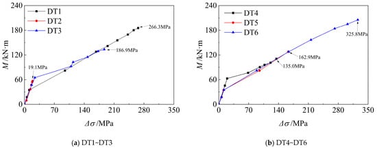 During the staged loading process, the prestressing tendon stresses at measurement point C2 were measured at each loading stage. These measurements were used to determine the stress increments associated with the increasing mid-span bending moments. The moment–tendon stress increment (Δσp) relationships for all six specimens are presented in Figure 8, where the vertical axis represents the applied mid-span bending moment induced by external loads only (excluding self-weight). The results indicated that for specimen DT2, the load–stress increment curve is approximately linear, indicating consistent flexural stiffness throughout loading. In contrast, the other five specimens exhibit bilinear behavior, with a distinct reduction in slope beyond a certain moment threshold—indicating stiffness degradation likely due to cracking or nonlinear material response. Table 6 summarizes the effective prestress values in the strands before and after loading. While initial values exhibited slight variations across specimens, the average initial effective prestress was approximately 905.1 MPa.
