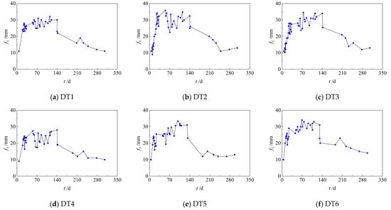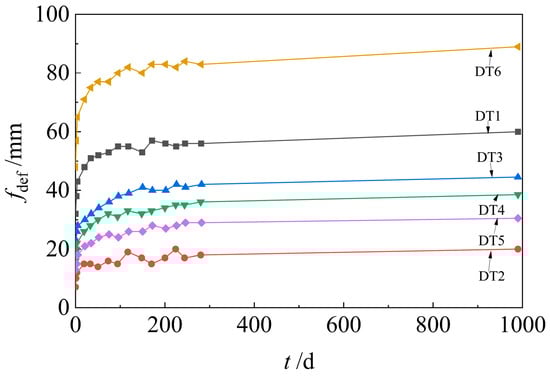 The time-history curves of long-term mid-span deflection for the prestressed concrete double tees under sustained loading are shown in Figure 12. In the plot, the horizontal axis t represents the duration of sustained loading, while the vertical axis fdef denotes the mid-span deflection relative to the initial value immediately after completion of the stacked loading (defined as t = 0), with downward deflection taken as positive. The results indicate that long-term deflection followed a typical time-dependent trend, characterized by a rapid increase during the early stage of sustained loading, followed by a gradual slowdown and eventual stabilization. The rate of deflection growth was strongly affected by the magnitude of the applied sustained load. Specimens subjected to higher load levels exhibited larger increases in early stage deflection. For example, at t = 5 days, the uncracked specimen DT2 exhibited a deflection increase of only 5 mm, while cracked specimens experienced increases ranging from 12 to 21 mm—approximately 2.4 to 4.2 times greater than the increase observed in DT2. By t = 50 days, the average deflection across all specimens had reached 79% of the final deflection measured at t = 990 days, indicating that the majority of long-term deformation occurred within the early phase of sustained loading.