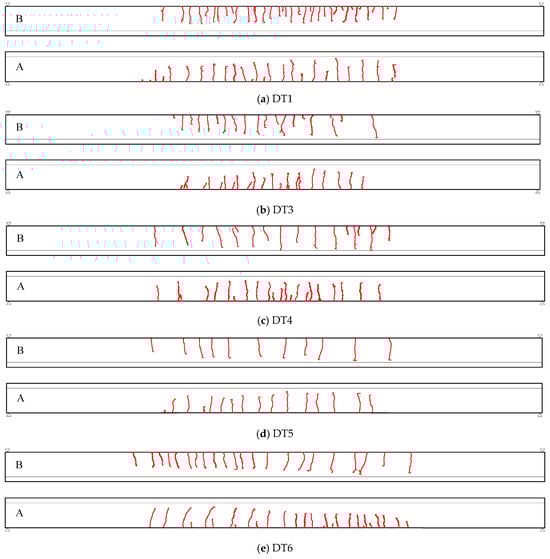 (2) Crack Propagation Stage: Once cracking initiated—typically at mid-span—the cracks propagated longitudinally toward the supports. Initial cracks developed rapidly and were especially pronounced, with lengths reaching 80–90% of the rib height. Except for specimen DT4, which cracked at load level 2, the remaining five cracked specimens exhibited initial cracking at load level 3.