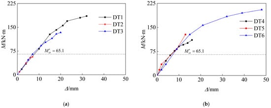 The mid-span moment–deflection (M–Δ) responses of all six specimens under staged loading are presented in Figure 11. In the plots, the horizontal axis Δ represents the vertical deflection relative to the pre-loading condition (positive downward), while the vertical axis M denotes the bending moment at mid-span induced solely by externally applied loads (self-weight excluded). For reference, the calculated cracking moment in accordance with GB/T 50010-2010 [13] is indicated in each case. At load levels 1 and 2, the cross-sections remained uncracked, and the specimens exhibited a nearly linear elastic behavior, characterized by a proportional increase in deflection with applied moment, which indicates that flexural stiffness remained essentially constant during the uncracked phase. Upon cracking, a significant reduction in stiffness occurred, as reflected by a clear change in slope in the M–Δ curves. Except for DT2, which remained uncracked throughout loading, the five cracked specimens showed a characteristic bilinear behavior.