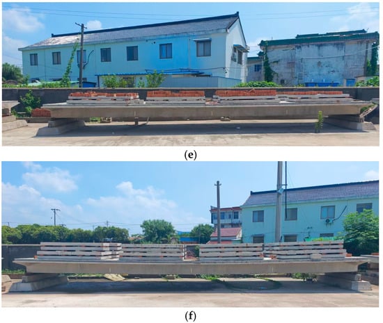Loading was conducted in incremental stages, with each loading level applied symmetrically. The detailed loading schedule for all six specimens is provided in Table 5. The values shown represent the equivalent uniformly distributed loads, including self-weight; loading level 0 indicates that no external load was applied. To investigate the relationship between long-term deflection and sustained load level in double tees, the target final loads for specimens DT1 through DT6 were designed as 0.77 qu, 0.52 qu, 0.67 qu, 0.63 qu, 0.66 qu, and 0.81 qu, respectively. A comparison between the cracking load (qcr) and yielding load (qy) revealed that specimen DT2 remained uncracked after loading, whereas the other specimens exhibited cracking but did not reach yielding. All specimens were configured as simply supported beams. The roller support consisted of a cylindrical steel roller clamped by upper and lower steel bearing plates, while the pinned support was achieved by welding two steel bars beneath the roller to restrict horizontal movement.