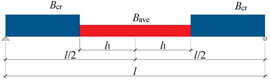 In conventional beam-type specimens, short-term flexural stiffness is typically evaluated using the moment–curvature relationship within a well-defined pure bending region. However, due to the uniformly distributed loading applied to the double-tee specimens in this study, a distinct pure bending region was absent. Furthermore, shear effects induced a non-uniform distribution of curvature along the specimen length. To address these complexities, an equivalent stiffness method was employed as a means of simplified analysis. Specifically, it was assumed that the influence of shear force on curvature could be neglected. The specimen was conceptually divided along its length into cracked and uncracked regions and assigned stiffness values Bcr (uncracked) and Bave. (cracked). Owing to the observed uniform distribution of cracks, a linear variation in stiffness was assumed across the cracked region. The distance between the uncracked region and the mid-span was included in the analysis, as illustrated in Figure 14.