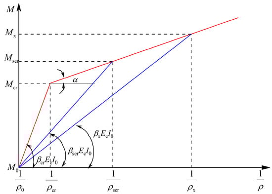 According to the provisions of the Chinese code GB/T 50010-2010 [13] and the European standard EN 1992-1-1: 2023 [14], the moment–curvature (M–1/ρ) relationship of cracked members is commonly idealized using a bilinear model. As illustrated in Figure 15, M0 denotes the decompression moment for prestressed members, and the initial slope corresponds to the elastic stiffness before cracking. Based on this bilinear model, the analytical relationships are formulated as follows: