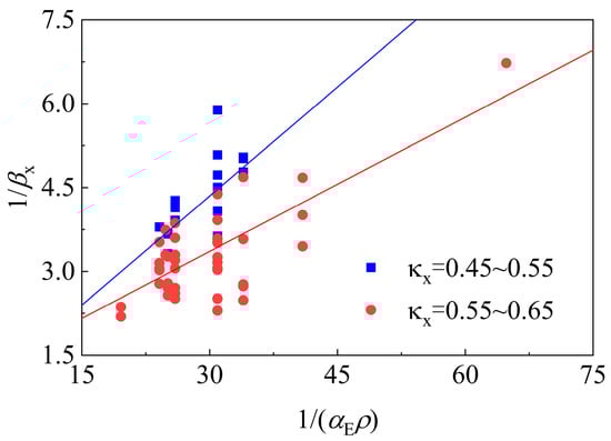 According to the reference [26], parameters and exhibit an approximately linear correlation. The validity of the proposed relationship was verified using experimental data with values of parameter approximately within the target range, as illustrated in Figure 16. It can be observed that, under consistent values of , a generally linear correlation exists between parameters and for double-tee specimens. Given the limited amount of test data, was taken as 0.6, and regression analysis was performed using results in which the actual value of ranged between 0.58 and 0.62, thereby establishing a fitted relationship between and . Substituting the regression outcome into Equation (9), the final expression for calculating ω was obtained.