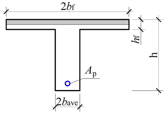 where denotes the modular ratio between reinforcement and concrete, which for double tees is taken as the ratio between the elastic moduli of prestressing tendons and concrete; ρ represents the longitudinal tensile reinforcement ratio; b0 is the width of the flange panel; bave, bf, h, and hf are simplified sectional dimensions of the double tee (as shown in Figure 17), corresponding to average rib width, effective flange width, overall section depth, and flange thickness, respectively.