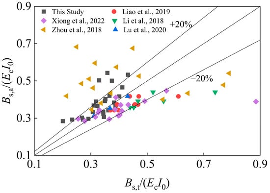 A total of 14 prestressed concrete double tees with varying cross-sectional geometries and reinforcement configurations were compiled from references [12,13,14,15,16,17,18,19,20,21,22,23,24,25,26,27,28,29] to validate the proposed method for estimating short-term flexural stiffness. The key design parameters of these specimens—including rib width (b), overall depth (h), flange width (bf), flange thickness (hf), span length (l), concrete compressive strength (fcu), and tendon stress (σcon)—are summarized in Table 9. The reinforcement configurations include various combinations of prestressing tendons with different diameters and quantities per rib. These published data were combined with the test results to assess the applicability of the proposed stiffness prediction method. For each specimen, several loading conditions within the post-cracking and pre-yielding range were selected. Using Equation (10), the stiffness ratio ω was computed and substituted into Equation (8) to obtain the predicted post-cracking stiffness Bs,a. A comparison between the predicted values Bs,a and the experimentally measured stiffness values Bs,t is shown in Figure 18. The majority of specimens exhibited deviations within ±20%, indicating good agreement between theoretical predictions and test data. The average ratio Bs,a/Bs,t was found to be 1.049, with a corresponding coefficient of variation of 0.331, indicating that the stiffness prediction method yields a reliable estimate of the post-cracking stiffness for double tees under uniform loading.