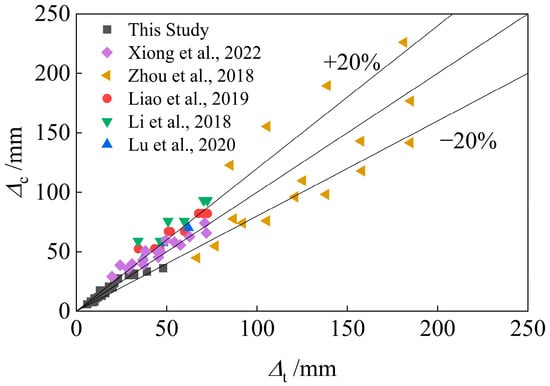 According to the provisions of GB/T 50010-2010, the deflection of prestressed concrete flexural members may be calculated using structural mechanics principles, with the assumption that the member exhibits uniform cross-sectional properties. Specifically, the code adopts the minimum stiffness approach, whereby the member’s flexural stiffness is taken as the lowest value at the section of maximum moment. Using the average flexural stiffness of the cracked region derived using the proposed method, the mid-span deflection Δc was calculated and then compared with the corresponding experimental measurements Δt. As shown in Figure 19, the ratio Δc/Δt exhibited an average value of 1.093, with a coefficient of variation of 0.203. These results indicate that the calculated deflection was slightly larger than the measured values, reflecting a conservative estimation. The overall findings suggest that for prestressed concrete double tees, the minimum stiffness principle combined with the proposed stiffness evaluation method offers both accurate and conservative prediction of mid-span deflection under service loading conditions.