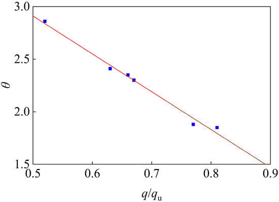 After 990 days of sustained loading, the ratios of long-term to initial mid-span deflection for specimens DT1 through DT6 were recorded as 1.88, 2.86, 2.30, 2.41, 2.35, and 1.85, respectively. Figure 20 shows the correlation between the sustained load level and the long-term deflection behavior. In the figure, the vertical axis θ denotes the amplification ratio of mid-span deflection after 990 days relative to the initial value, while q denotes the applied sustained load, and qu is the theoretical ultimate load capacity. The results clearly show that the long-term deflection amplification factor θ exhibits a linear negative correlation with the load ratio q/qu, which indicates that as the load level increases, the relative amplification of long-term deflection decreases. The regression equation is given in Equation (13), with a coefficient of determination R2 of 0.988, reflecting a high degree of linear correlation.