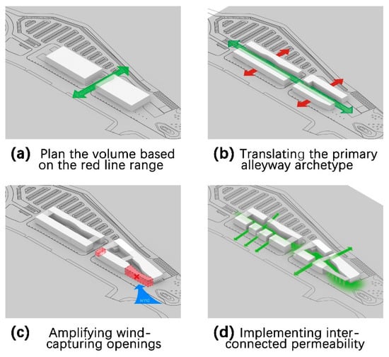 - Translating the primary alleyway archetype: Building masses are oriented along the southwest–northeast axis, segmented to form a central arterial street space.