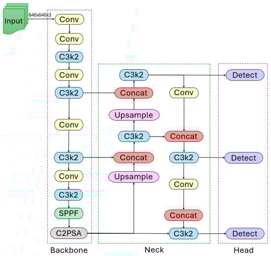 The YOLOv11n variant is selected as the baseline model due to its suitability for deployment in real-time and embedded detection scenarios, particularly critical for tasks such as monitoring construction workers’ use of protective equipment like helmets and safety vests [27]. As illustrated in Figure 1, YOLOv11 architecture consists of three primary components: a backbone for robust feature extraction, a neck structured around the Feature Pyramid Network (FPN) for effective multi-scale feature fusion, and a head optimized for object classification and localization.