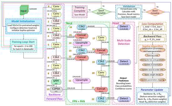 The proposed SC-YOLO integrates the CSPDarknet backbone with Sophia optimizer, enhancing detection performance for complex construction site monitoring scenarios. As illustrated in Figure 5, the architecture demonstrates interactions among its backbone, neck, and detection head components through a comprehensive training workflow.