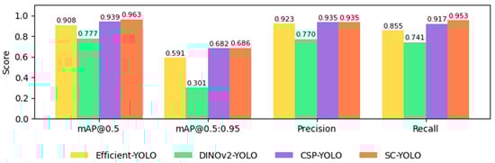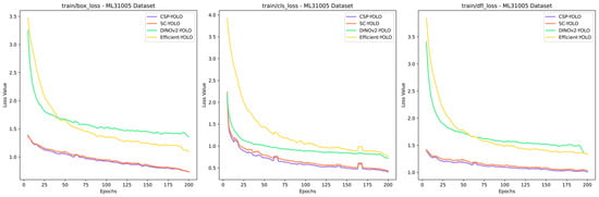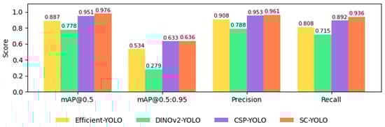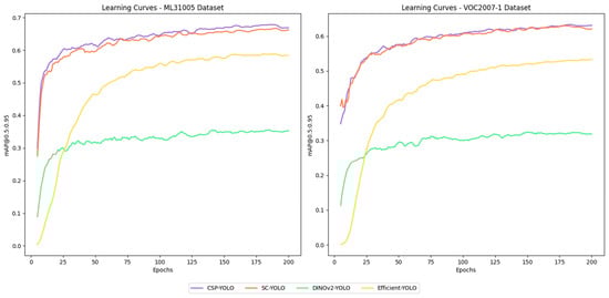 Computational efficiency analysis (Figure 17) reveals SC-YOLO achieves improved performance with modest training time increase: 4.5 s per epoch on ML-31005 and 5.6 s on VOC2007-1, compared to CSP-YOLO’s 4.2 and 5.3 s, respectively. This modest computational cost, consistent with Liu et al.’s [14] findings, is well-justified by performance improvements. In contrast, DINOv2-YOLO requires the longest training time (5.1 and 6.4 s), while Efficient-YOLO was the third fastest (4.7 and 5.9 s).
