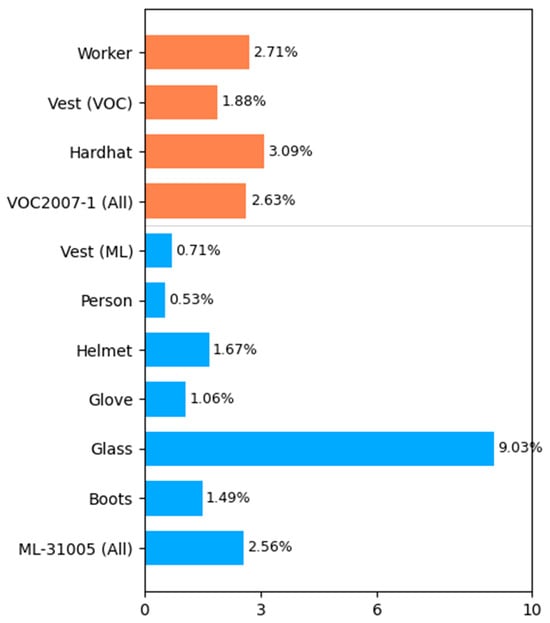 Detection of small and occluded PPE components—like gloves and safety glasses—presents ongoing technical challenges [4,5]. Several models have developed customized strategies for improved robustness in these scenarios. For example, MARA-YOLO [29] leveraged MobileOne and receptive field fusion to enhance multi-class PPE detection. SDCB-YOLO [25] and MEAG-YOLO [30] incorporated multi-scale attention mechanisms to resolve feature confusion in overlapping PPE regions. Meanwhile, semi-supervised methods [31] and edge-device deployment models [28] have emphasized practical integration in safety-critical settings.