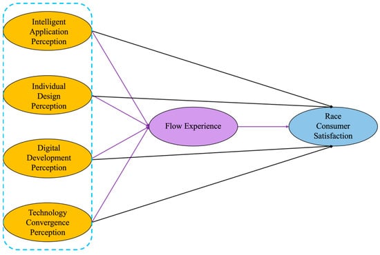 In sports venues, intelligent application can make it easier for spectators to enter a state of mindstream by providing personalized and real-time interactive services that enhance their engagement and immersion in the event. The flow experience plays an important mediating role between the perception of intelligent application in sports venues and race consumption satisfaction. When spectators use the smart ticketing system to enter the stadium quickly, find their seats easily through smart navigation, or understand the game dynamics through real-time data, they are prone to a flow experience, and this deep immersion state makes them more engaged in the event. The mind-flow experience gives spectators a stronger sense of pleasure and fulfillment during the viewing process, thus increasing their overall race consumption satisfaction. Capasa et al. point out that technologies such as virtual reality (VR) can effectively trigger the mind-flow experience of spectators, significantly enhancing their immersion and event engagement. The study showed that the combination of intelligent equipment and real-time interaction made spectators more likely to have a mind-flow experience, which directly increased the satisfaction of event consumption []. Lee and Zhou investigated the effects of VR technology on spectators’ emotions and cognition and found that intelligent arena equipment allowed spectators to focus more on the game process, which enhanced the mind-flow experience and ultimately increased spectators’ event satisfaction []. Chang et al. emphasized the important role of the mind-flow experience in enhancing spectator satisfaction; especially, the convenience and interactivity of intelligent application in sports venues enable spectators to enter the mind-flow state more easily []. Glebova et al. emphasized the importance of the mind-flow experience generated when spectators interact with technology in smart venues through the analysis of digital technology, which makes spectators more engaged in the process of spectating, and significantly improves the overall attractiveness of the tournament, which significantly improves the overall attractiveness of the event and spectator satisfaction []. In light of the above, this study puts forward the following hypothesis: