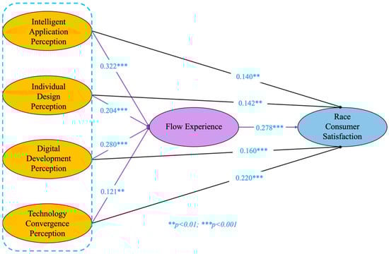 The results of the study show that the flow experience plays a significant mediating role in the influence of intelligent application perception, personality design perception, digital development perception, and technology integration perception on race consumption satisfaction in sports venues. The core idea of the flow theory suggests that when spectators are in a state of mind-flow, they show higher levels of immersion and satisfaction []. By optimizing the application of technology, design experience, and service functions, stadiums create an environment that stimulates a mind-flow experience for spectators, further enhancing their race consumption satisfaction.