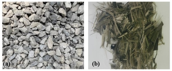 The cement was Conch brand P·O 42.5 OPC produced by Shaanxi Qinling Cement Company, and its physical properties and chemical composition are shown in Table 1. Fly ash (Grade I) was produced from HSBC New Materials Co., Ltd. in Panzhihua, China, and the sieve allowance was 16% by a 5 μm square hole. The basic properties and main components of FA are shown in Table 2. The alkaline excitation solution was prepared by Na2SiO3 and NaOH. Na2SiO3 (8.5% Na2O, 26.5% SiO2, and 65% H2O, wt%) was a colorless viscous liquid produced by Henan Bingrun Casting Materials Co., Ltd. in Gongyi, China, with a modulus and Baume of 3.12 and 40° Bé, respectively. NaOH was produced at the Kelong Chemical Reagent Factory in Chengdu, China. It was a solid sheet-like particle with purity ≥ 98.0% and was used to regulate the modulus of Na2SiO3. NaOH solution should be prepared at least 24 h before pouring because it will release a lot of heat in water and cause the temperature of the activator to be too high, resulting in temperature cracks in the specimen. The CA consisted of continuous graded crushed stone and CG with a size of 5–20 mm. The CG was produced in Fuyang City, Anhui Province, and was crushed by a jaw crusher and manually screened, as shown in Figure 1a. The specific parameters are shown in Table 3. The fine aggregate was selected from ordinary zone II river sand (The particle size is 0.35–0.5 mm), and the performance indicators are shown in Table 4. BF was purchased from Changzhou Bochao Engineering Materials Co., Ltd., as shown in Figure 1b. The physical and mechanical parameters were shown in Table 5, where d was the diameter of the monofilaments, l was the stub length, ρ was the density, E was the Young’s modulus, ft was the tensile strength, and δ was the ultimate elongation. The water-reducing agent was the FDN high-efficiency water-reducing agent, purchased from Shaanxi Jingcheng Water-Reducing Agent Engineering Company, and its performance parameters are shown in Table 6. The water was ordinary tap water from the laboratory.