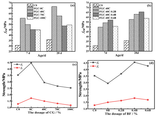 Mechanical strength of all specimens: (a,b) fcu; (c,d) ff and ft.