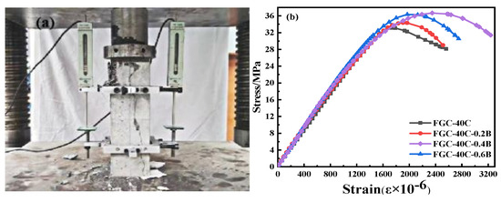 Based on the experimental time and material cost, this article only focuses on the effect of BF reinforced CG-FA-GPC and analyzes the stress–strain curve of FGC-40C-yB group concrete, as shown in Figure 3. In the early stage of the experiment, as the load continued to increase, the deformation value of the FGC-40C specimen approached the ultimate tensile deformation, and the increase in load value was no longer significant. During the loading process, when visible fine cracks appeared on the surface of the specimen, the phenomenon of rapid crack development can be observed with a “bang” sound under continuous loading and finally presented as a crack that runs through the upper and lower parts, dividing the specimen into two parts. This is because the strength of the CG coarse aggregate itself is low, and under ultimate load, bond fracture and aggregate fracture occur between the aggregate and the mortar.