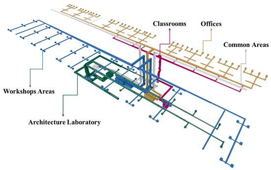 Isometric view of the ventilation system of the School of Architecture. Blue: ducts supplying the workshop areas. Green: architecture laboratory area. Yellow: office area. Purple: classroom area. Grey: common area ducts.