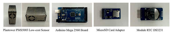 The sensors were compatible with the open-source Arduino electronics platform, an easy-to-use hardware and software solution. Therefore, they were integrated into autonomous systems (Figure 5), each including an Arduino Mega 2560 (controller and data receiver); the PMS5003 OPC; a MicroSD card adapter (data storage) module; and an RTC DS3231 real-time clock module (timekeeping and timestamping). Modules were set up on a breadboard, and power was provided by a 36,800 mAh power bank. One of the aims of the workshop was to instruct the students to assemble the air quality sensors. Therefore, a document was created explaining all the steps necessary to put the sensor into operation. Guidelines were also produced to operate the Arduino board with a program previously created and tested by the teaching staff. In the Supplementary Files can be found: 1. instructions on how to connect the components used to build the prototype to the Arduino board; 2. a list of the prototype components, to facilitate the search and acquisition of the components; and 3. the programming lines for the low-cost sensor used in this study with the Arduino software (version Arduino 1.8.19).