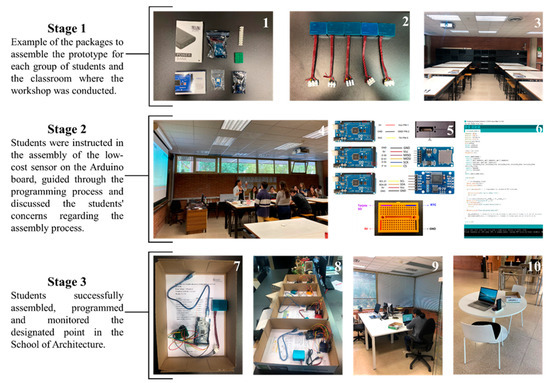 Photographs of the three stages involved in the workshop. Stage 1: (1). One of the component kits was handed out. (2). Pre-assembly of the LCS. (3). Classroom with the kits. Stage 2: (4). Students and researchers during the workshop. (5). Sample of handout materials. (6). Sample of the Sketch code uploaded to the Arduino boards. Stage 3: (7,8). Prototypes already assembled by the different groups of students. (9). A student prepares to monitor office 1111. (10). Monitoring at the ground floor’s hall.