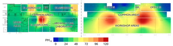 Distribution of PM10 (µg/m3) across the building. Data interpolated by inverse distance weighting among all sampling points from the maximum of each 15 min average over the entire sampling campaign. Left: lower floors; right: upper floors. The architecture laboratory shares a classroom volume with the adjacent classroom block (dashed line). RR: Restrooms. (N.B. Color scale does not intend to represent the AQI color scheme but the mapped PM levels.).