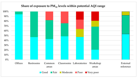 Individual measurements were used to estimate the proportion of time each school area was experiencing PM levels that, if sustained over time, would result in the corresponding AQI levels (Figure 8). While 90% of measurements in the office area stayed below 20 μg/m3 PM10 (good air quality), better than the external reference, all other areas except restrooms were subject to worsening conditions with less than 50% good air quality. Especially, laboratories and workshop areas would be subject to high levels of more than 10% of the time for PM10, although all areas stayed within low PM2.5 levels.