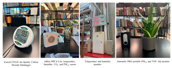 It is important to consider the operational schedule of the building: it remains closed over weekends, with the heating and air conditioning systems turned off from Saturday noon until early Monday morning. It is plausible that the elevated concentrations on Monday’s result from the accumulation of indoor pollutants over the weekend, in the absence of regular ventilation, coupled with emissions generated by renewed activity at the start of the week. However, the low and stable levels in the office areas suggest that the pollution sources are likely dependent on specific educational activities deployed according to schedule. Based on these findings, the researchers recommended the implementation of corrective measures. The initial step involved encouraging school staff to maintain constant vigilance over their respective work areas. Furthermore, a comprehensive roadmap for the continuous monitoring of key locations within the school was presented to the administration. To support this monitoring effort, sensors were installed throughout the building (Figure 10). In addition, a research project (E3LAB) was developed in the building that consisted of the installation of more than 50 sensors, allowing the precise monitoring of variables such as temperature, humidity, CO2 levels, and solar radiation [33]. This will serve as a foundation for future projects involving the installation of air quality sensors. Additionally, the research team presented its research to the administration on mitigation strategies, the ease of implementation, and the costs of implementing an HVAC system with ventilation filters or using portable cleaners in buildings [42]. To bridge the gap in the curriculum identified in this research, the teaching team has published a book (Indoor Air Quality. Notes for Architects [43]), which will be part of the content of the building services II subject. Thus, an educational workshop deployed within a living campus setting turned out to produce results that were both useful and actionable, resulting in effective management decisions with the potential to improve the educational, environmental, and health conditions for a large cohort of people in the university.