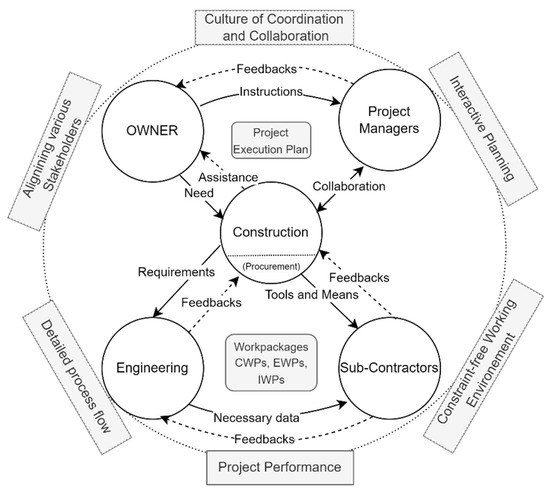 IPD is an approach to project management that emphasizes collaboration and integration between all stakeholders, including owners (principals and operators), project managers, and construction teams [24], see Figure 1. The key concept behind IPD is the formation of a collective environment with shared risks and benefits, which aligns the interests of all parties toward the common goal of project success. IPD optimizes project results in terms of time, cost, and quality [24], while combining individual skills and talents and deferring the reward of profits to the end of the project [15]. It represents a significant departure from the traditional sequentially awarded contracts that offer little flexibility and from the design–build approach [19], where actors collaborate with the intention of a project-centered interest [25]. The key to this departure is segmenting tasks and responsibilities. IPD also supports a wide range of projects with varying degrees of complexity, duration, and scales [26], and is often practiced in health, public procurement, industrial, and infrastructure projects, where coordination and collaboration among stakeholders are critical for project success [19].