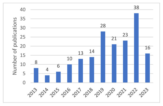 Major academic databases, such as Google Scholar, Web of Science, and Scopus, were queried, initially yielding 485 articles. Duplicate records and articles from unrelated fields were removed. The remaining abstracts and keywords were reviewed for relevance, resulting in a final selection of 181 pertinent records. Their temporal distribution over the study period is shown in Figure 4.