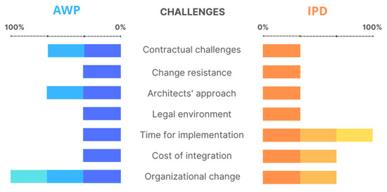 Implementing either AWP or IPD requires substantial investments in time, training, contractual restructuring, and organizational change [31,37], which may pose difficulties for smaller projects [38]. The challenges identified in the literature can be grouped into seven categories: (i) contractual environment, (ii) change resistance, (iii) architectural mindset, (iv) legal structures, (v) implementation time, (vi) integration cost, and (vii) organizational transformation.