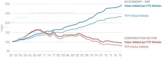 Productivity growth in the construction sector has consistently underperformed compared to other economic sectors. Over the past two decades, construction productivity has increased by only 10%, while overall global economic productivity has risen by more than 50% [2]. On average, annual labour productivity growth in construction has remained below 1%, significantly lagging behind the 2.8% yearly growth in the overall world economy and the 3.6% observed in manufacturing [2,3]. In the United States, construction productivity—measured through labour and total factor productivity (TFP)—initially exceeded national averages in the mid-20th century but began a sustained decline in the 1970s, continuing downward for over 50 years [4].