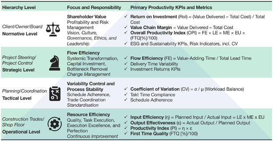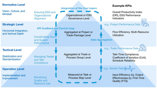 System architecture of the hierarchical productivity framework. The framework integrates operational, tactical, strategic, and normative layers associated with specific performance metrics. Data flow upward through the aggregation of efficiency and quality metrics and downward via feedback loops that align ESG and productivity targets with frontline process control. The architecture supports integration of real-time sensing, takt planning, AI-based monitoring, and modular construction systems.