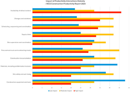 Perceived impact of productivity interventions according to construction practitioners (adapted from the RICS Construction Productivity Report 2024 [63] based on 3285 global company responses). Reprinted/adapted with permission from Ref. [63]. 2025, Aarni Heiskanen/AEC Business.