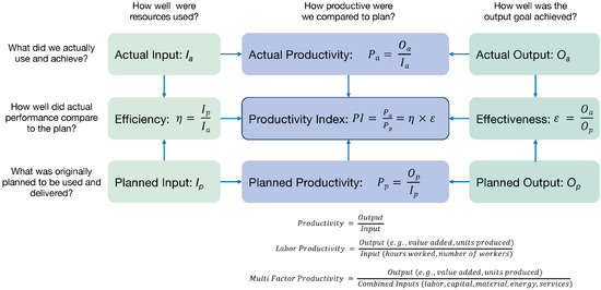 Moreover, standard productivity metrics frequently conflate planned and actual performance or mix units inconsistently, leading to limited comparability and interpretability. To address these issues, Figure 4 introduces a conceptually rigorous and physically coherent productivity model that differentiates between: