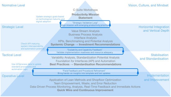 The modular and scalable system architecture, illustrated in Figure 2, depicts the logical structure, data flows, and feedback mechanisms across the four abstraction levels. Real-time indicators such as input efficiency and First-Time Quality are captured at the operational layer and aggregated through takt time performance and flow stability at the tactical and strategic levels. These metrics ultimately inform a normative layer synthesising project-wide productivity and ESG compliance into an Overall Productivity Index (OPI). Feedback loops enable top-down alignment, allowing normative goals to recalibrate tactical priorities and operational execution. The system architecture provides a scalable foundation for AI integration, sensor-driven monitoring, and platform-based process control.