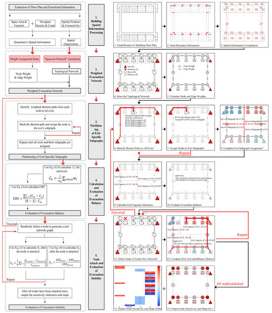 Analytical workflow and schematic representation of a teaching building. 1 In labels 6, 7, and 12, red lines show paths from functional nodes to exits, with thicker lines indicating shorter distances. 2 In label 8, the red dashed lines indicate the divided node attribution sets. 3 In label 11, the red “×” indicates that the node has been deleted. 4 The black arrows between the labels indicate the next step, while the red arrows represent looping steps.