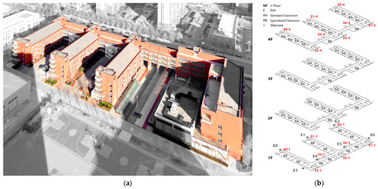 - Cao, S.; Zhang, J. Research on the Functional Layout of Elementary School Building Based on the Perspective of Safe Evacuation. South Archit. 2024, 5, 58–69. [Google Scholar] [CrossRef]