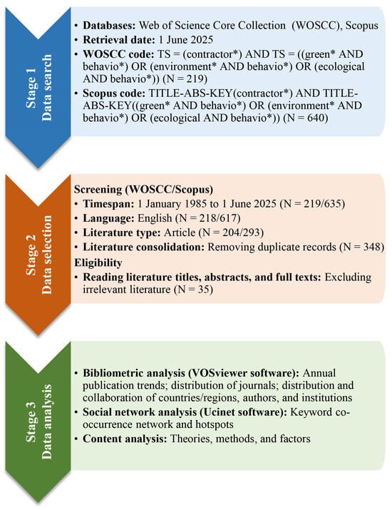 The search query was developed through a review of relevant literature and consultations with senior researchers in the field. Searches were conducted in the “TS” field of the WOSCC database and in the “TITLE-ABS-KEY” field of the Scopus database using the following search query (retrieval date: 1 June 2025): (contractor*) AND ((green* AND behavio*) OR (environment* AND behavio*) OR (ecological AND behavio*)), where the asterisk (*) denotes any sequence of characters, including none. This search yielded 219 documents from the WOSCC database and 640 from Scopus, resulting in a total of 859 documents.