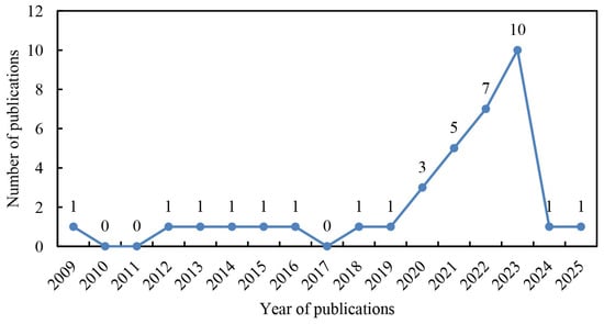 The number of publications serves as a key indicator for assessing the current state and trends in a research field []. By statistically analyzing the publication years of the 35 selected papers, this study constructs a trend graph depicting the annual publication distribution. As shown in Figure 2, from 2009 to 2019, the annual publication volume remained low, averaging one paper per year, totaling eight papers. During this period, research in this field remained marginalized. However, a significant increase in publication volume was observed from 2020 to 2023, with 25 papers accounting for 71.43%. This surge indicates that the field attracted substantial academic attention during this phase, experiencing a notable increase in research activity and interest, peaking in 2023, with ten papers. The number of publications in both 2024 and early 2025 (as of 1 June 2025) remains at one paper each. While a sharp decline in publication volume is apparent in 2024 compared to 2023, this trend should be interpreted cautiously given the incomplete data for 2025. This observed decline might be attributed to academic dissemination lag rather than a genuine decrease in research interest. Further observations are required to determine the long-term trajectory of this field.