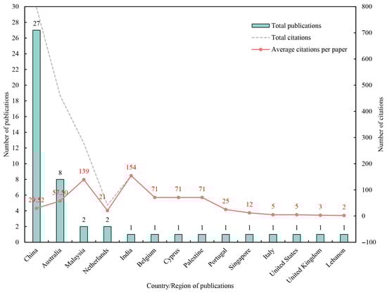 The spatial-geographical distribution of research activity can be identified by analyzing publication volume and collaboration networks among countries/regions []. Such analyses offer insights into the performance of various countries/regions concerning knowledge creation and academic collaboration []. According to the collected data, 14 countries have contributed to research on contractors’ green behavior. Figure 3 presents the number of publications, total citations, and average citations per paper for each country. China (27 papers) and Australia (8 papers) rank first and second in terms of publication volume, respectively, highlighting their significant contributions to knowledge production in this field. However, the average citations per paper for research originating from China and Australia are relatively low, at 29.52 and 57.50 per paper, respectively. Therefore, the international impact of research output from these two countries warrants enhancement. As shown in Figure 3, India has the highest average citations per paper (154), followed by Malaysia (139). Belgium, Cyprus, and Palestine each have an average citation count of 71 per paper, ranking third.
