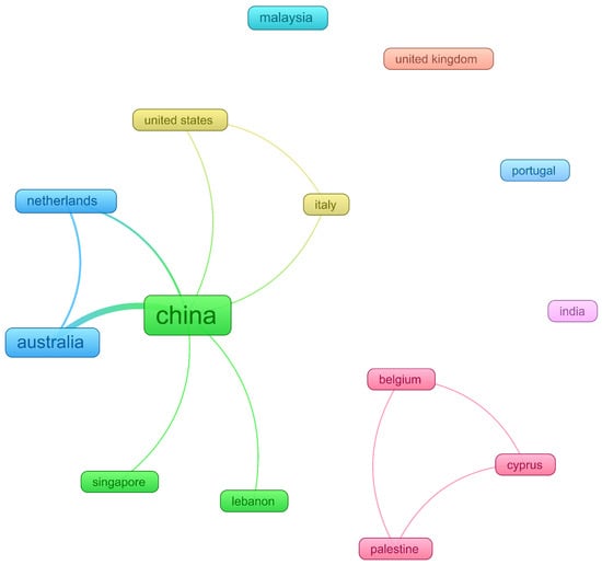 To further analyze international collaboration patterns, this study used VOSviewer to construct a visualized network of inter-country collaborations. In this network, node size is proportional to the publication volume of each country’s publications, while the thickness of connecting lines is proportional to the strength of collaboration between countries. Different colors represent distinct clusters of countries/regions. As illustrated in Figure 4, the overall network comprises 14 nodes and 11 lines, with a network density of 0.12, suggesting limited collaboration among countries. From a localized network perspective, China emerges as the most active country in terms of collaboration, with the highest number of cooperative instances with Australia (six times) and the Netherlands (two times). A collaborative relationship is also observed between Belgium, Cyprus, and Palestine. However, India, Malaysia, the United Kingdom, and Portugal conduct research independently, without explicit collaboration with other countries.