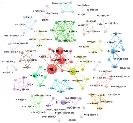 where M represents the minimum publication threshold for prolific authors, and Nmax denotes the publication count of the most prolific author. In this study, with Nmax = 4, the maximum integer value of M is 2, indicating that authors with at least two papers are considered prolific. As shown in Table 2, there are seven prolific authors, six of whom are from China, highlighting the dominant role of Chinese researchers in this field. Among them, Ge Wang, Jian Zuo, Qinghua He, and Zilun Wang exhibit significantly higher average citation counts than the others, underscoring their influence in the field. VOSviewer is used to visualize the author collaboration network. As illustrated in Figure 5, the network consists of 128 nodes and 243 links, with a network density of 0.030, indicating a relatively dispersed and partially isolated structure. From a localized network perspective, multiple collaborative subnetworks have formed around authors such as Ge Wang, Hongwei Fu, and Yao Zhang. Although these subnetworks exhibit varying degrees of internal collaboration, most remain unconnected to others. Notably, three subnetworks centered around Ge Wang (in collaboration with Qinghua He and Zilun Wang), Jian Zuo, and Huijin Zhang have established interconnections, facilitating broader academic collaboration within the field.