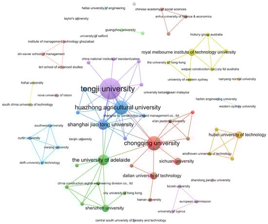 Analyzing the distribution and co-occurrence of research institutions can identify key institutions and their collaborative networks, thereby assessing their research capacity in the field []. The authors of the reviewed publications are affiliated with 65 institutions, with higher education institutions playing a dominant role, accounting for 53 (81.54%). In contrast, corporate institutions have limited participation, with only six institutions (9.23%) involved. Notably, 31 higher education institutions in China contribute to 47.69% of the total, positioning China as a central hub in research on contractors’ green behavior. Given the maturity and objectivity of Price’s law, this study continues to use it as the basis for identifying prolific institutions. Institutions with two or more publications are classified as prolific institutions. As shown in Table 3, there are ten prolific institutions, eight of which are affiliated with China. Tongji University stands out in terms of publication volume, establishing itself as a major contributor to this field. Moreover, the University of Adelaide leads in average citations per paper, suggesting a relatively mature research output. The institutional collaboration network, as visualized in Figure 6, comprises 65 nodes and 87 links, with a network density of 0.042. This density indicates that inter-institutional collaboration remains relatively weak, and a tightly knit cooperative network has yet to be established. From a localized network perspective, while many institutions engage in some level of collaboration, their partnerships remain limited in scope, with low frequency and intensity. Notably, four subnetworks centered on Tongji University, Huazhong Agricultural University (in collaboration with Shanghai Jiao Tong University), Chongqing University, and the University of Adelaide demonstrate closer and stronger collaborative ties, forming relatively cohesive localized networks.
