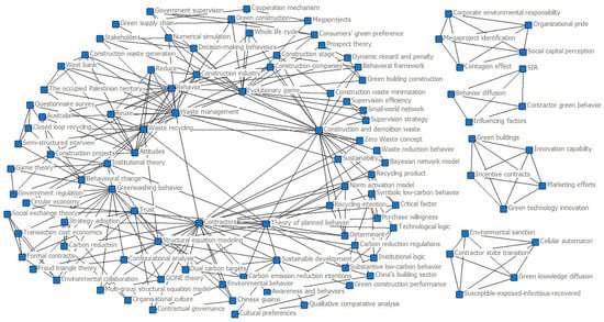 - Network density and clustering coefficient. Network density is a key metric for describing the overall connectivity of a network, reflecting the degree of closeness among nodes []. Higher density implies stronger inter-node relationships and greater overall integration. The clustering coefficient measures local network cohesion, reflecting the extent to which nodes form localized clusters []. A higher clustering coefficient suggests strong localized clustering and greater internal cohesion []. The keyword co-occurrence network for contractors’ green behavior exhibits a low density (0.055) and a high clustering coefficient (0.889), indicating a loosely coupled structure. This result suggests that although the field encompasses a wide range of topics, these topics are relatively dispersed with limited interconnection, resulting in the formation of localized knowledge clusters.